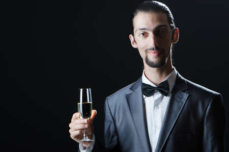 cropped photo of cheering tuxedo man. tuxedo man cheering isolated on black background. tuxedo man cheering in studio. tuxedo man cheering with champagne.