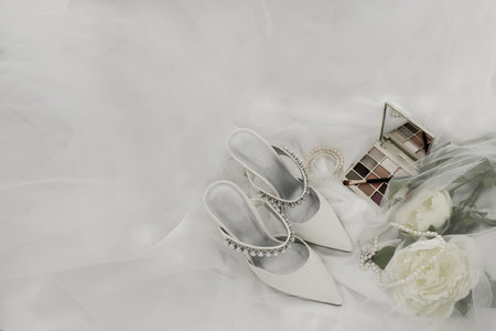 Elegant white bride shoes. Wedding accessories. Preparations