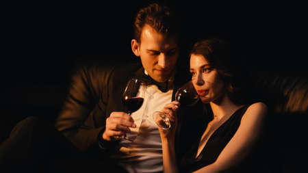 young elegant couple holding glasses of red wine isolated on black