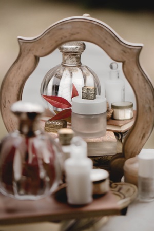 Wedding lace garter and perfume waiting bride. Selective focus.