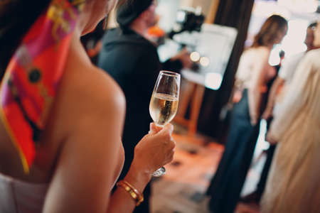 rear view woman holding misted chilled glass of champagne in hand at party.