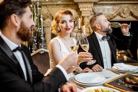 Elegantly dressed group of people having a festive dinner at a well-served table near the christmas tree, celebrating New Year holiday at the luxury restaurant