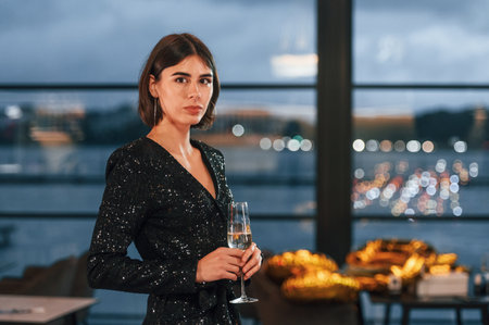 Holding champagne. Beautiful young woman in black dress is standing near the window on a new year party.