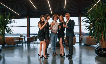 Smiling for the camera. Group of people in beautiful elegant clothes are celebrating New Year indoors together.