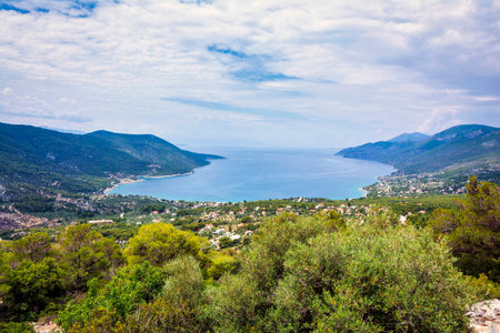 Panoramic view of the town and coast of Porto Germeno, or Aigosthena, in Attica, Greece.