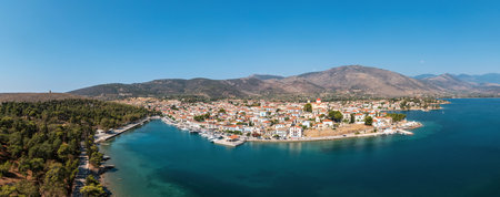 Galaxidi Greece, aerial drone view. Traditional town in Fokida, waterfront houses, sunny day, blue sky and sea.