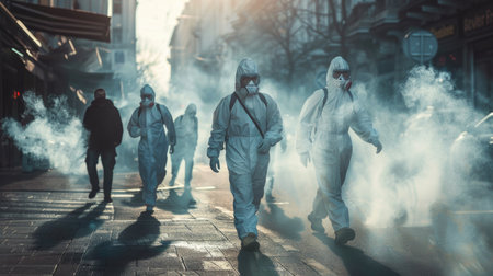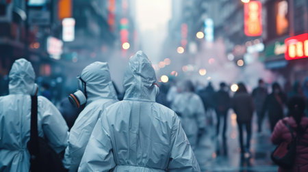 Coronavirus 2019-nCoV. Group of people in protective suits and masks walking in the street.