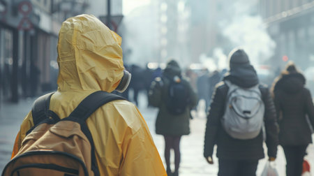 health impacts of air pollution a person wearing a protective mask in a heavily polluted area, emphasizing the need for respiratory protection.