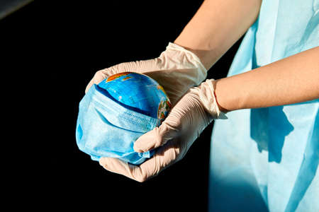 Globe in a medical mask in the hands of the doctor in hard light, Symbol that people all over planet are quarantined due to epidemic and pandemic
