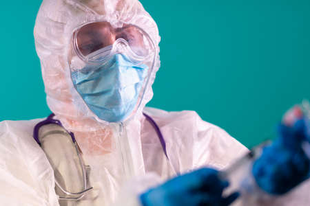 Man doctor or scientist waring protective suit, and face mask