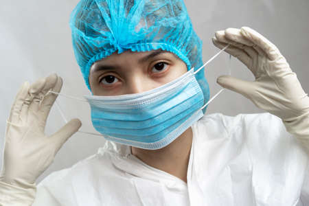 portrait of a female nurse or doctor putting on a medical face mask.