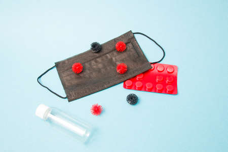 virus models on a black medical protective mask, antiseptic bottle, pills in red bluster, blue background, copy space, coronavirus 2020, top view