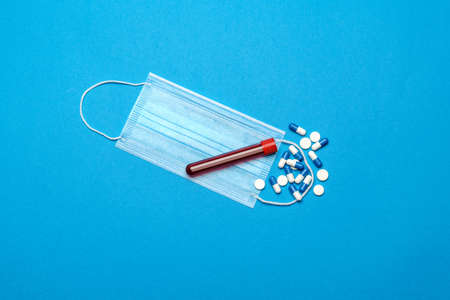 Protective medical face masks, test tube with blood sample and pills on a blue background - Top view with copy space