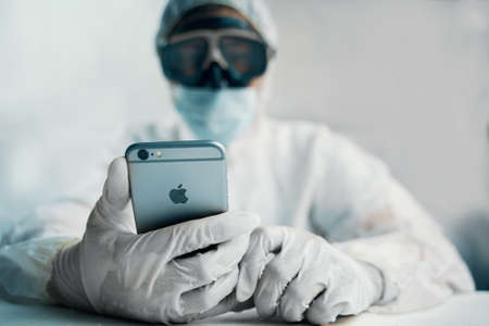 Bishkek, Kyrgyzstan - Marth 14 2020: Bio hazrd man with iphone. Man lookin for situation in world, in protective suit.