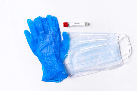 A test tube for collecting analysis for coronavirus, thin blue medical gloves and protective face masks. Disposable gloves and masks for protection against covid-19 virus