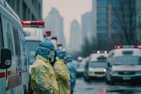 Medical personnel in protective gear stand by, while lines of ambulances wait outside hospitals to address the urgent health situation.