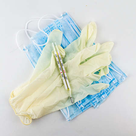 medical hygiene masks rubber surgical gloves and thermometer on a white background top view