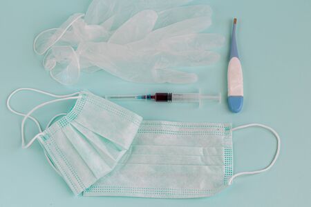 protective medical mask, sanitizer gel and gloves. protective measures against virus, bacteria