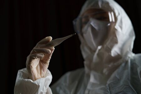 Woman wearing gloves with biohazard protective suit and mask. With unhappy face, hand holds Thermometer checking temperature.