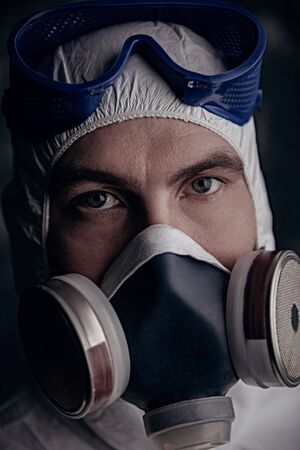 A man in a protective suit on a black background. Protection against virus outbreaks.