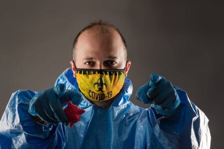 Virologist in a medical mask and protective clothing holds a test tube with positive blood sample for coronavirus testing. Pandemic covid19.