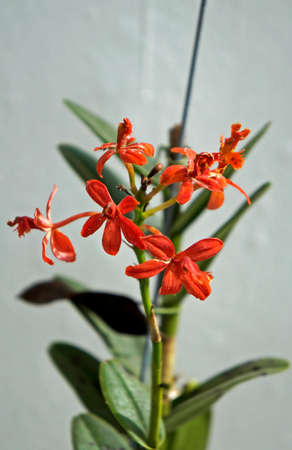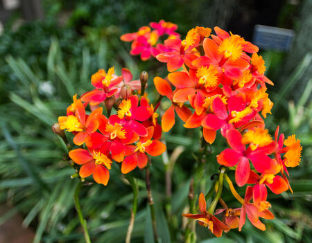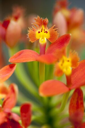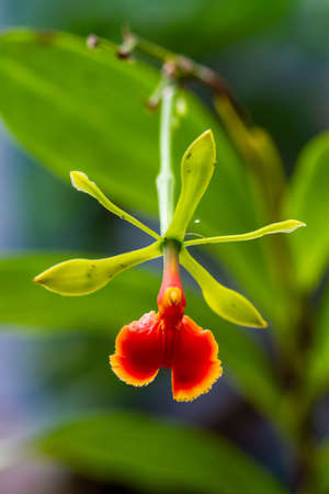 Photo of the flower of Epidendrum radicans, a species of orchid also known as ground-rooting epidendrum, fire-star orchid, rainbow orchid, and reed-stem epidendrum that grows in Central America.