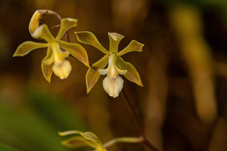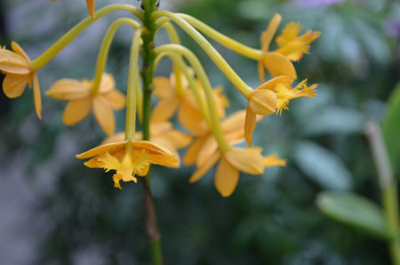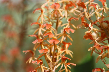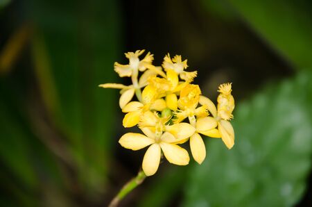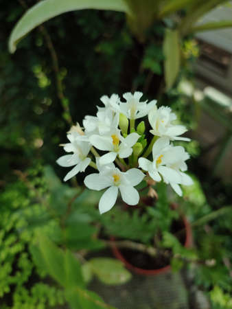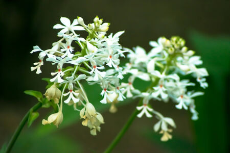 Close up of a tiny beautiful bunch of green white dendrobium orchid flower in a garden