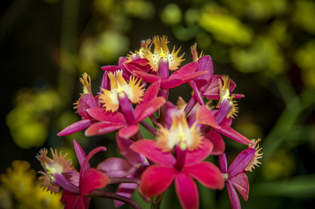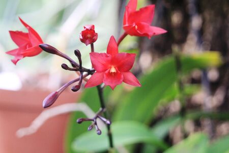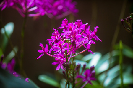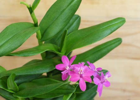 Epidendrum ibaguense orchid with crimson-pink flowers on a wooden background, selective focus, horizontal orientation.