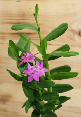 Epidendrum orchid with crimson-pink flowers on a wooden background, selective focus, vertical orientation.