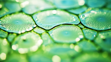 Fantasy plant cells microscopy. Green organic structures. Microlife concept. Generative AI.