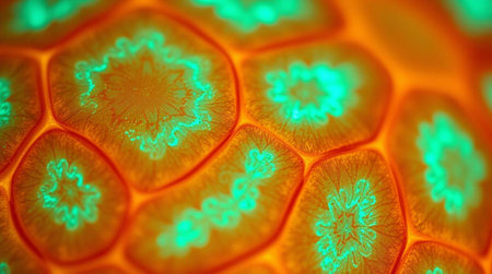 Microscopic view the vibrant cross-sections of plant cells, showcasing intricate patterns and vivid colors in hues of orange, purple, and pink. each cell's unique structure and internal details are visible, illustrating the complexity of cellular organization. Generative AI