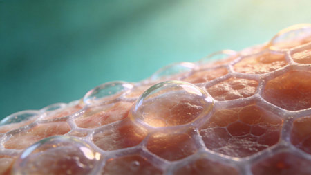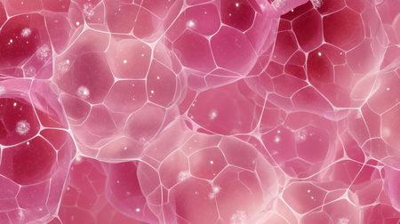 This abstract image showcases a microscopic view of delicate cell structures in pink and clear tones. The hexagonal shapes and bubbles create a captivating visual texture.
