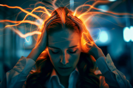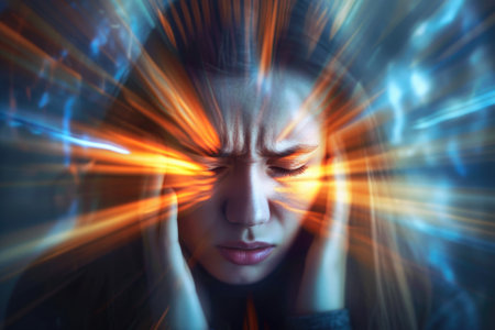 A man with a severe headache holds his head in his hands, his face contorted in pain, and blurry, distorted light streaks through the image, creating a sense of disorientation and anxiety.