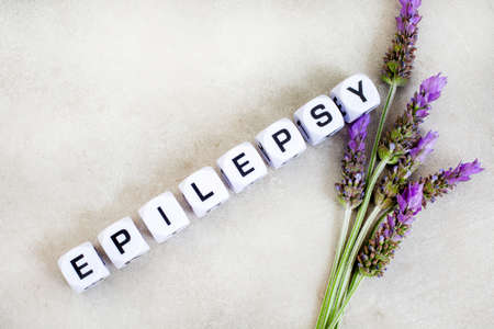 Epilepsy written in dice with lavender on mottled grey with copy space