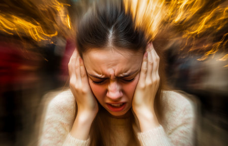 A young woman expresses distress, covering her ears with a pained expression amid blurred background