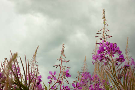Close up bright purple Willow herb (fireweed or Ivan-tea) Elobium flowers, growing on the meadow