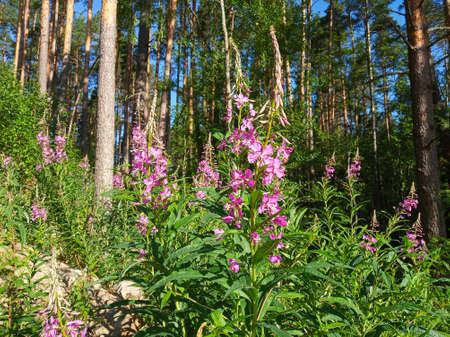 Wild chamaenerion purple flowers in a forest, fireweed plant