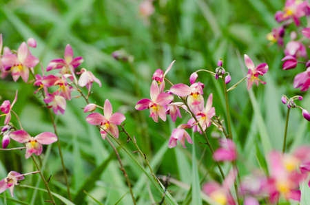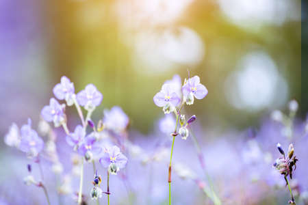 soft focus beautiful landscape of beautiful rain forest with green grass, little purple and pink flowers Murdannia giganteum nature background