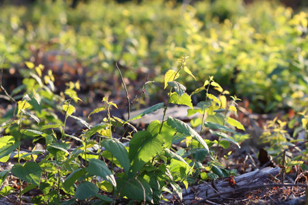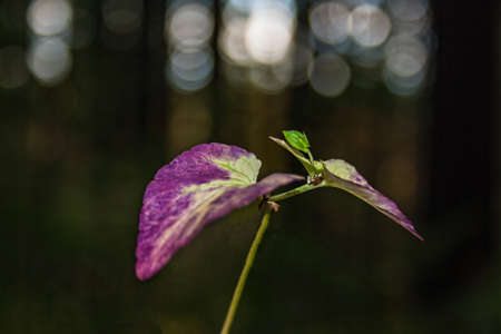 The picture of nature that focused to the green leaf from tree in the forrest that stay on ground and got illuminated with bright light of a sunlight in the summer or spring time of the year. AIGX03.