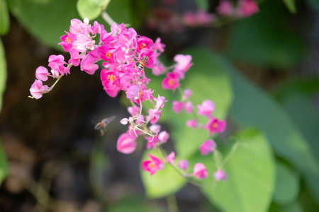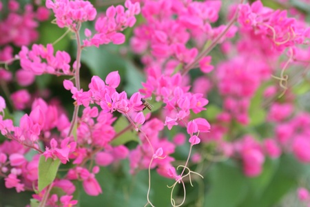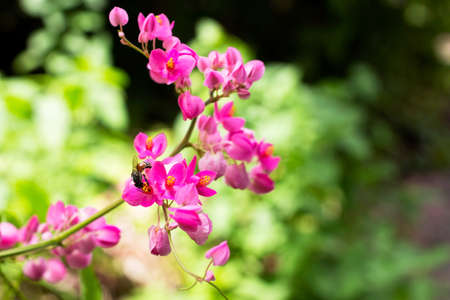 Bee on Antigonon leptopus flower. Honeybee is important pollinator for flower.