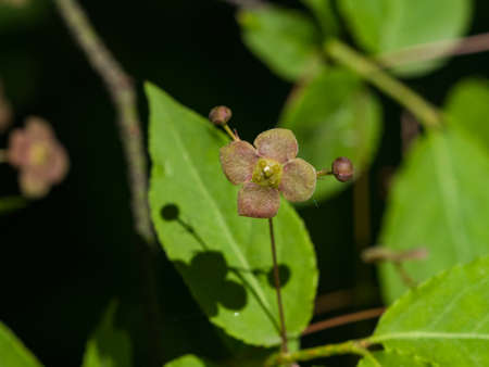 Small flower and buds on Spindle Tree, Euonymus Verrucosus, macro, selective focus, shallow DOF.