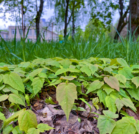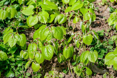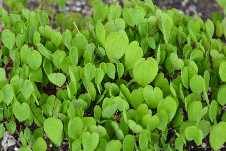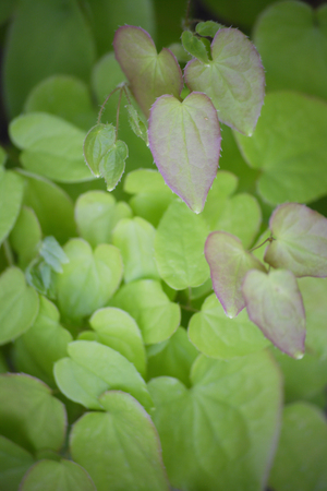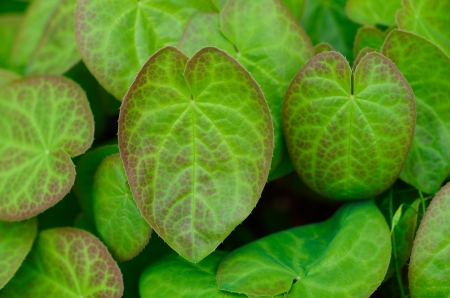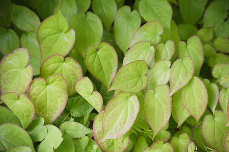 A group of epimedium leaves provide ground cover in a shady flower bed