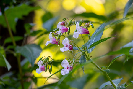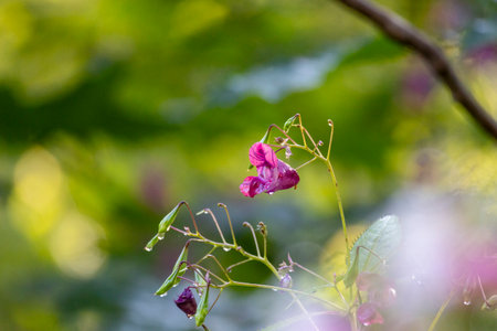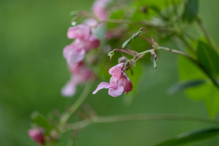 A beautiful close-up of a pink Himalayan Balsam flower blooming in a summer meadow. A seasonal scenery of rural Latvia, Europe.