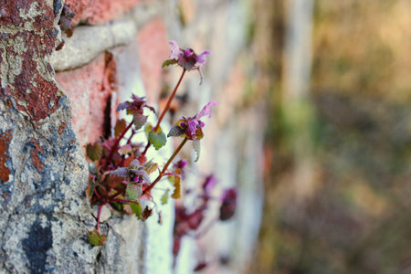 Red deadnettle (Lamium purpureum) growing from a crack in the wall.