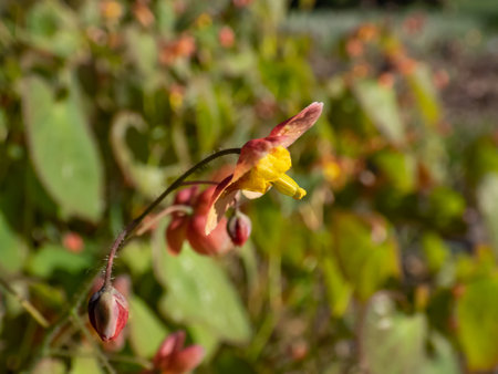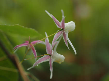 Epimedium rubrum flowers or flower elves, macro photography, selective focus, blurred background, horizontal orientation.