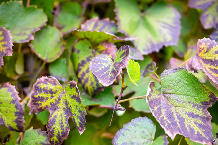Close up of diseased grapevine leaves showing signs of rubella and leaf curl, focusing on the mottled coloration.