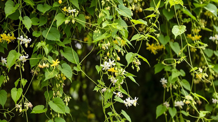 A lush green vine with white flowers hanging down, creating a natural curtain. The delicate white blooms are scattered among the vibrant green leaves, adding a touch of elegance to the scene.