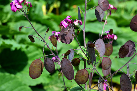 Lunaria annua - annual honesty. Ornamental pods of lunaria in spring.Green lunaria plant in the garden. The second year of the plant's development. Lunaria flowers and fruits.