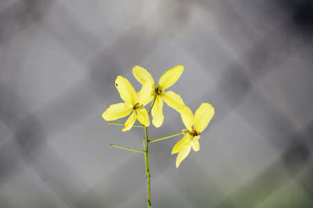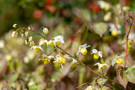 Epimedium Fukujuji close up flowered yellow blossoms in the garden in spring.