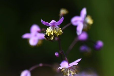 Thalictrum rochebruneanum flowers. Ranunculaceae perennial plants. Grows in moist meadows with bright yellow anthers and magenta flowers in summer.